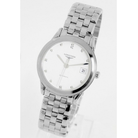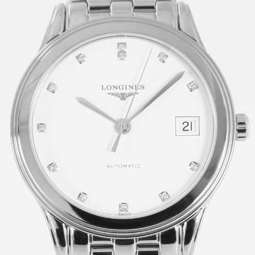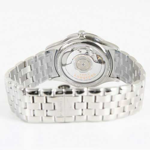 ホワイト文字盤にシルバーの指針、ダイヤインデックスを配置。12時位置にブランドロゴ、3時位置に日付表示、6時位置にオートマチックであることを示す刻印。