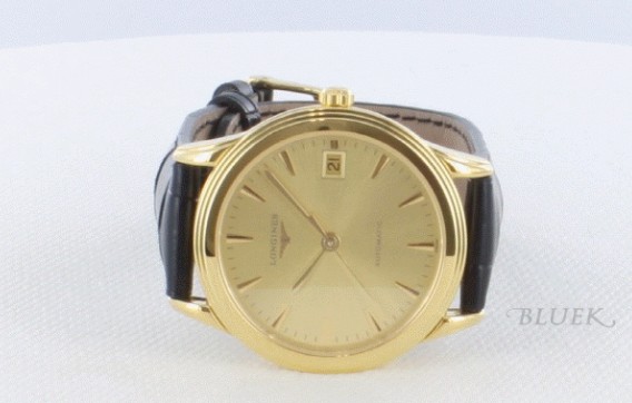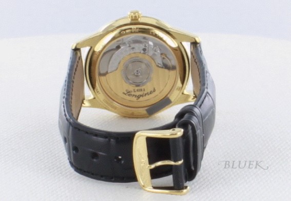 金無垢イエローゴールドボディにゴールド文字盤が浮かび、ブラックレザーでシンプルクラシカルに仕上げ ました。フェイスではすっきりとしたフェイスが味わい深く時を刻み、視認性抜群。バックスケルトンでわずか7mmの厚さの自動巻きムーブメントの動きを堪 能でき、35mmサイズで50gが軽快にフィットします。