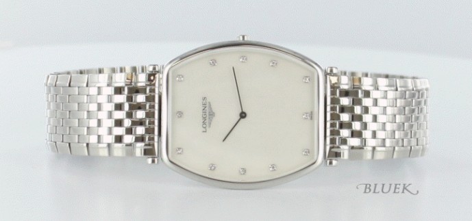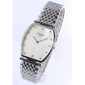 ロンジンは1832年にスイスのサンティミエにて創業。1919年から国際航空連盟に公式採用され、人 類初の大西洋単独無着陸飛行の成功へと導き、航空機産業を躍進させた。世界130ヶ国以上に展開しているスイスの高級腕時計メーカー。シンプルにこだわっ たすっきりとしたデザインにはロンジンの歴史を感じさせる堂々とした風格が漂うグランドクラシックシリーズ。一切の飾り気を排除したシンプルなデザインで 年齢を問わず着けていただけるベーシックなフォルムが特徴です。トノー型のケースは厚み約5mmと驚きの薄さ。ホワイトシェル文字盤上を12粒 (0.081ct)のダイヤモンドが控えめに飾ります。シンプルなデザインにすることでよりビッグフェイスが際立ち、上品さをプラス。9連からなる鏡面ブ レスは繊細な雰囲気です。
