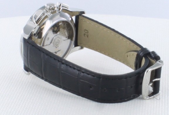 ホワイト文字盤にブラックレザーの色合いがコントラストなスタンダードフラッグシップです。フェイスに はくさびインデックスが角度によりきらきらと、インダイヤルや4時から5時位置の日付表示を搭載。バックスケルトンでムーブメントの動きを堪能。シーンを 選ばないビジネススタイルにもぴったりな時計です。