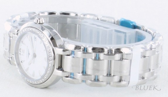 シルバーラウンドボディにダイヤベゼルが美しくホワイト文字盤はシンプルに、5連デザインブレスが艶や かに仕上げたドレスウォッチです。落ち着いたフェイスにはシルバー指針が映え、3時位置に日付表示が搭載され機能性も美麗に組み込んでいます。気取らない 高級感で普段使いにも最適な、26mmで女性らしいサイズは手元にぴったりとフィットし飾ります。