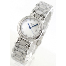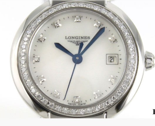 ベゼルとインデックスに、上質なダイヤモンドをふんだんに使った、たいへんゴージャスなプリマルナ3針 モデルです。ダイヤモンドの贅沢な煌めきが、柔らかな光沢のホワイトシェルダイヤルに映えて、見事な輝きを放っています。この美しいダイヤルに、絶妙なア クセントを与えているのがブルースティール指針。ロンジンらしい意匠が、モダンで洗練された印象を広げています。26ミリサイズもほどよく、女性らしく丸 みを帯びたブレスレットの存在感も抜群。日付表示窓は実用性も高く、毎日お洒落に使えるブレスウォッチです。