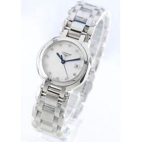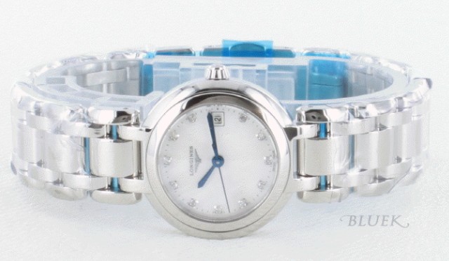 シルバーラウンドボディにホワイトシェル文字盤やダイヤインデックスが美しく、角が丸い5連デザインブ レスが艶やかに仕上げた可愛らしいウォッチです。ピュアなフェイスにはブルー指針が映え、3時位置に日付表示が搭載され機能性も美麗に組み込んでいます。 26mmで女性らしいサイズは手元にぴったりとフィットし品よく飾ります。