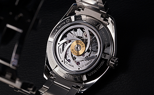 ブルーPVD仕上げのダイアルにボンド家の紋章を入れ、自動巻きローターには、あの有名なオープニング・シークエンスに登場する銃口と拳銃の薬莢をイメージした造形が施され、時計全体でボンド・モデルであることを示している。