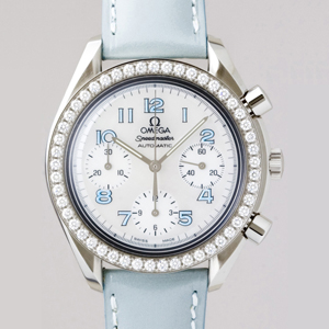 OMEGAオメガ コピー スピードマスター ダイヤベゼル ライトブルー革 ホワイトシェルブルーアラビア 3815.71.53