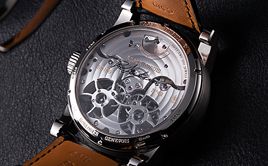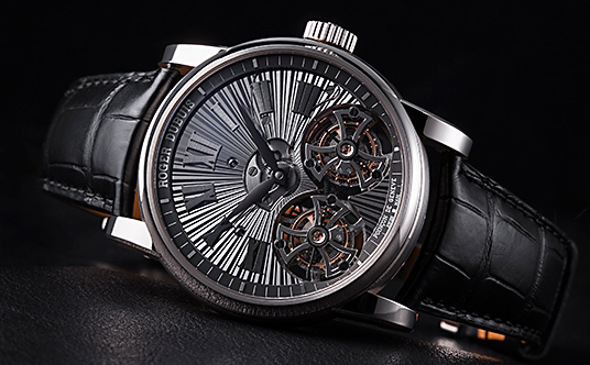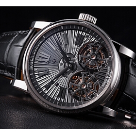 見る人の気持ちをとらえて離さない圧巻のビジュアルこそが、ロジェ・デュブイが最も得意とするスタイルであり、他社が真似できない個性だが、このムモデルもムーブメント地板に直に手作業で放射線状のギョーシェを彫り込み、ダイヤルに見立てている。