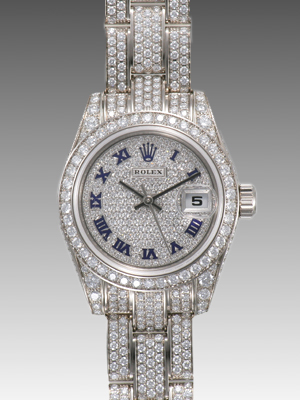 豪華絢爛にダイヤのあしらわれたモデル。文字盤?ケース?ブレスレットにビッシリと敷き詰められたダイヤの輝きが、店頭に展示してる際も女性の目を惹きつけてます。
