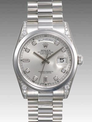文字盤の10Pとケースのラグの部分にダイヤモンドをセッティングした豪華なデイデイトです。プラチナの輝きと重量感もあわせてお楽しみ頂ける時計です。