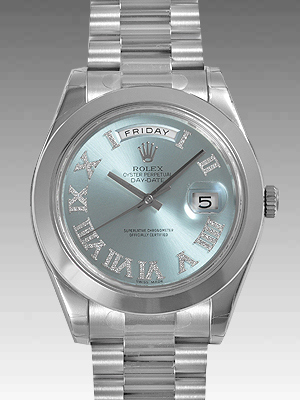 デイデイトⅡのプラチナモデルの専用色「アイスブルー」に新たに、追加されたダイヤローマンインデックスモデルです。