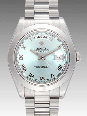 デイデイトⅡのプラチナモデルに、プラチナモデルの専用色?アイスブルー?とローマンインデックスを合わせたモデルです。