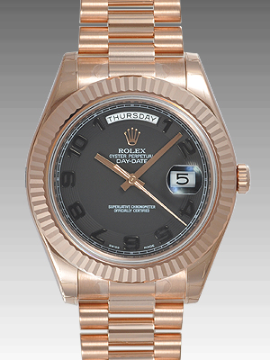 デイデイトIIのエバーローズゴールドケースに、スポーティーなブラックアラビア文字盤をあわせたモデルです。