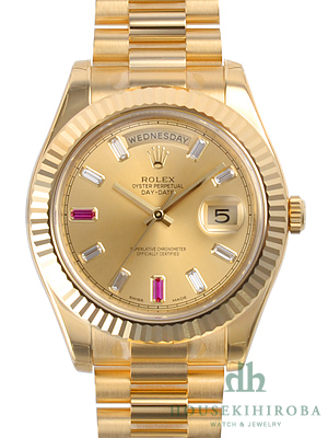 デイデイトⅡのイエローゴールドモデルに、珍しい8ポイントバゲットダイヤ?2ポイントバゲットルビーインデックスを合わせたモデルです。