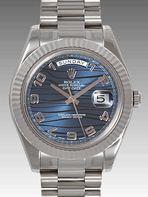 デイデイトⅡのホワイトゴールドモデルに、個性的なブルーのウェーブアラビアダイヤルを合わせた一本です。