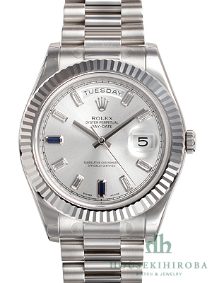 デイデイトⅡのホワイトゴールドモデルに、8ポイントバゲッドダイヤ・2ポイントバゲッドサファイヤインデックスを合わせたモデルです。