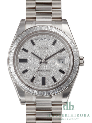 人気のデイデイトⅡのベゼルにバゲットダイヤモンドをセッティングしたモデルです。