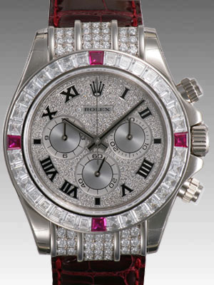 ロレックス唯一のクロノグラフ機能を備えたコスモグラフデイトナ。ルビーとダイヤを用いたベゼルに高級感と上品さを感じさせる、ラグジュアリーかつハイクラスなモデルです。