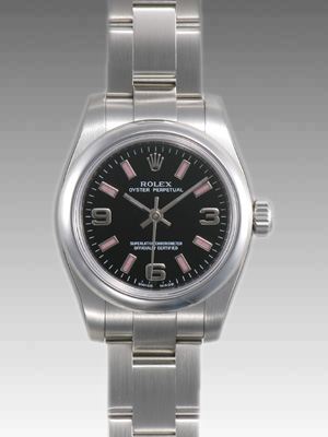 ROLEXの大人気モデル、オイスターパーペチュアルにNEWフェイスが入荷いたしました。ブラックの文字盤にピンクのバーがアクセントになっておりとてもキュートな時計です。